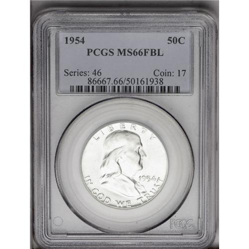 <B>1954<50C> MS66 Full Bell Lines PCGS.</B></I> A brilliant, exceedingly frosty and untoned example, with a few trivial marks near the center of each side, and a highly attractive icy-white appearance overall. Among the finest graded at either service. Population: 61 in 66, 0 finer (4/06).