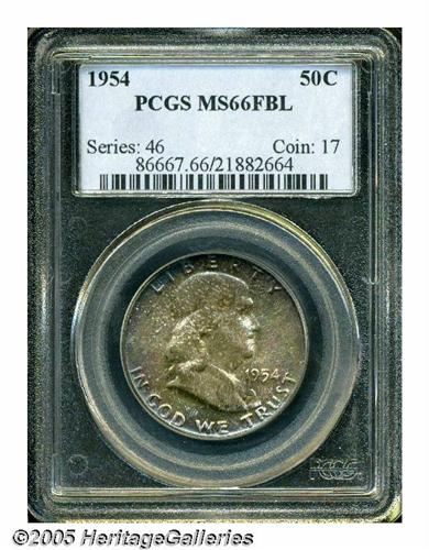 <B>1954<50C> MS66 Full Bell Lines PCGS.</B></I> Deeply toned on the obverse with a multitude of mixed iridescent colors. The reverse is mostly brilliant with some mottled peripheral color. Well struck and highly lustrous. Population: 57 in 66, none finer (6/05).