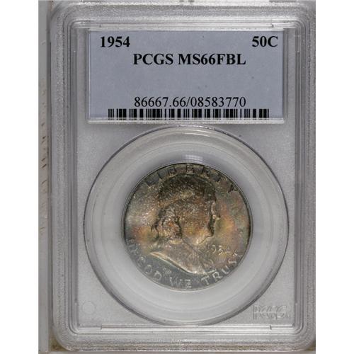 <B>1954<50C> MS66 Full Bell Lines PCGS.</B></I> Reddish-gold and violet patina covers the obverse, while the reverse has isolated spots of gunmetal toning at the periphery. An attractive coin, tied for the finest Full Bell Lines example certified by PCGS (8/06).