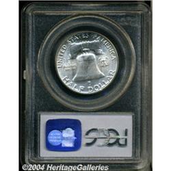 <B>1954<50C> MS66 Full Bell Lines PCGS.</B></I> Bright, creamy-white mint luster covers both sides of this exceptional MS66 example. Very scarce as such and quite unusual to locate in MS66 condition, much less two such coins in the same sale. Population: 40 in 66, 0 finer (7/04). <BR><BR><B>Important notice:</B> Heritage usually auctions material at the rate of 200-250 lots per hour. On some occasions eBay Live bid software or the Internet may not be able to keep up with the pace of the auction. We recommend placing a realistic absentee bid now as insurance to avoid disappointment. Occasionally the auctioneer may eliminate or reject an eBay Live bid, and the auctioneer may also reopen a lot after the close of the eBay live bidding (usually because we missed an audience bid), and may reject your bid even if it shows you as the winning bidder. By bidding via eBay Live, you agree that Heritage may award the lot to another bidder at its sole discretion under the circumstances described above or any other reasonable circumstances. Since eBay bids are not shown to us until we open the lot on the floor, we treat those bids just like floor bids. In most cases the floor responds before the eBay bid is presented to us, due to Internet lag time, so for consistency we have made it a policy that floor bids are always considered first over tie eBay live bids. Also please note that all Heritage lots purchased through eBay Live carry a 20% Buyer's Premium. Please make sure you read the Terms and Conditions before you bid. </span></font></tr></table></td></tr></table>
