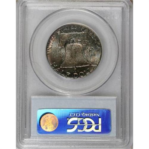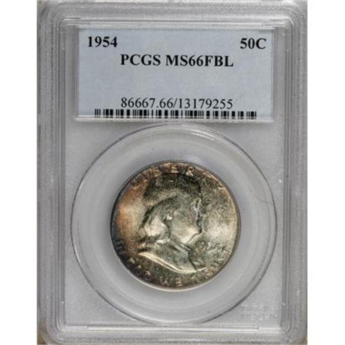 <B>1954 50C MS66 Full Bell Lines PCGS.</B></I> Dappled forest-green, gold, and ruby patina graces both sides of this strongly lustrous piece. Well-defined and carefully preserved for this mid-date issue, though a mark at the left lip of the bell precludes a Superb Gem designation. Tied for the finest Full Bell Lines example graded by either NGC or PCGS (5/07).<BR><BR><b>Shipping:</b> Coins & Currency (<a target="_blank" href="http://www.heritageauctions.com/common/shipping.php">view shipping information</a>)
