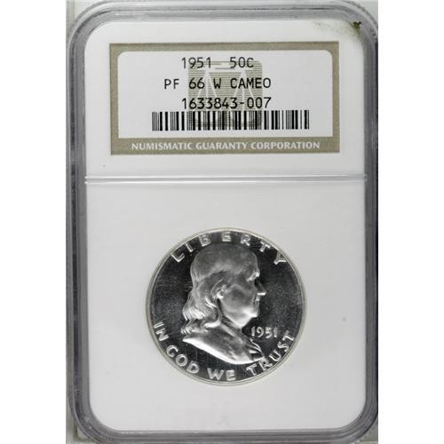 <B>1951 50C PR66 W Cameo NGC.</B></I> A lightly frosted and untoned Premium Gem that has moderate reflectivity. Boldly defined and appealing with no mentionable flaws.<BR><BR><b>Shipping:</b> Coin/Currency (<a target="_blank" href="http://www.heritageauctions.com/common/shipping.php">view shipping information</a>)
