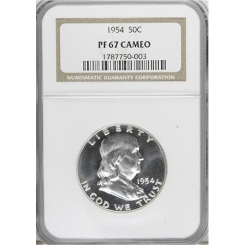 <B>1954 50C PR67 Cameo NGC.</B></I> NGC Census: (437/124). PCGS Population (216/26). Numismedia Wsl. Price for NGC/PCGS coin in PR67: $280. (#86695)<BR><BR><b>Shipping:</b> Coins & Currency (<a target="_blank" href="http://www.heritageauctions.com/common/shipping.php">view shipping information</a>)