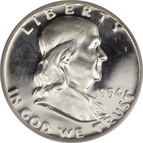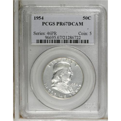 <B>1954 50C PR67 Deep Cameo PCGS.</B></I> Both sides present a brilliant-white appearance that allows full appreciation of the heavy field-to-device contrast. An exceptional specimen worthy of the finest Franklin half dollar collection or a remarkable quality 1954 proof set. Population: 27 in 67 Deep Cameo, 4 finer (3/07).<BR><BR><b>Shipping:</b> Coins & Currency (<a target="_blank" href="http://www.heritageauctions.com/common/shipping.php">view shipping information</a>)