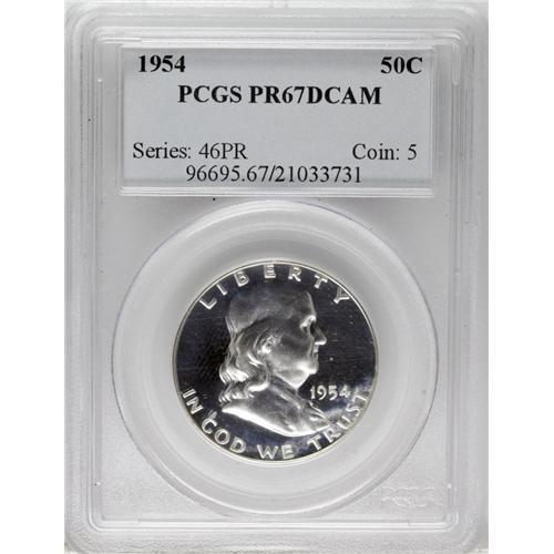 <B>1954 50C PR67 Deep Cameo PCGS.</B></I> Minor haze at the lower right obverse leaves the remainder of the piece unaffected, and both sides present a brilliant-white appearance that allows full appreciation of the heavy contrast. Boldly impressed and essentially devoid of blemishes with seemingly fathomless mirrors. Population: 27 in 67 Deep Cameo, 4 finer (11/06).<BR><BR><b>Shipping:</b> Coin/Currency (<a target="_blank" href="http://www.heritageauctions.com/common/shipping.php">view shipping information</a>)