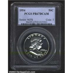 1954 50C PR67 Deep Cameo PCGS. The small eagle on the reverse offers light gold patina, while most of the coin is untoned. A razor sharp Superb Gem that has seemingly pristine preservation. A tiny hook-shaped lintmark (as struck) at the left end of the bust truncation serves as a pedigree for future auction appearances. Population: 22 in 67, 3 finer (7/02). Important notice: We expect to be auctioning lots at the rate of 200-250 per hour. Sometimes eBay Premier live bid software cannot keep up with that pace, so we strongly recommend that you place a realistic proxy bid now as insurance to avoid disappointment. Also please note that all Heritage/CAA lots purchased through eBay Premier carry a 20% Buyer's Premium. Please make sure you read the Terms and Conditions.