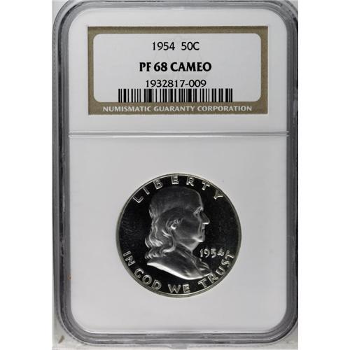 <B>1954<50C> PR68 Cameo NGC.</B></I> An attractive, nearly black-and-white specimen whose obverse falls just short of Ultra Cameo status. NGC has graded only two specimens at 69 Cameo (7/06).