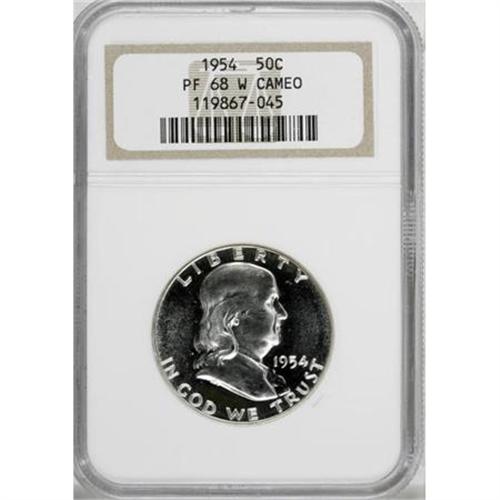 <B>1954 50C PR68 W Cameo NGC.</B></I> Cameo specimens are not as commonplace in the pre-1955 issues of the proof Franklin half series as in later years. This example is fully struck, with brilliant surfaces that show illimitable reflectivity in the fields, and mild frost on the devices. Handling marks and hairlines are nonexistent.<BR><BR><b>Shipping:</b> Coins & Currency (<a target="_blank" href="http://www.heritageauctions.com/common/shipping.php">view shipping information</a>)
