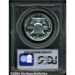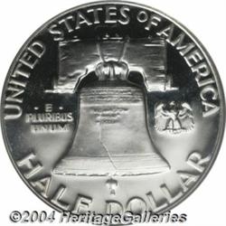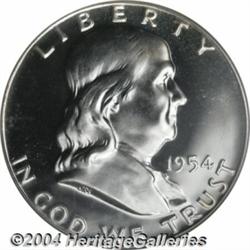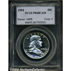 <B>1954<50C> PR68 Cameo PCGS.</B></I> Untoned and virtually flawless, with intense, two-sided contrast that places this dazzling specimen in the upper echelon of specimens from this year. Population: 17 in 68, 0 finer (4/04).<BR><I>Ex: Long Beach Signature Sale (Heritage, 2/01), lot 5997, which realized $1,955.</B></I><BR><I>From the JFS Collection.</B></I> <BR><BR><B>Important notice:</B> Heritage usually auctions material at the rate of 200-250 lots per hour. On some occasions eBay Live bid software or the Internet may not be able to keep up with the pace of the auction. We recommend placing a realistic absentee bid now as insurance to avoid disappointment. Occasionally the auctioneer may eliminate or reject an eBay Live bid, and the auctioneer may also reopen a lot after the close of the eBay live bidding (usually because we missed an audience bid), and may reject your bid even if it shows you as the winning bidder. By bidding via eBay Live, you agree that Heritage may award the lot to another bidder at its sole discretion under the circumstances described above or any other reasonable circumstances. Since eBay bids are not shown to us until we open the lot on the floor, we treat those bids just like floor bids. In most cases the floor responds before the eBay bid is presented to us, due to Internet lag time, so for consistency we have made it a policy that floor bids are always considered first over tie eBay live bids. Also please note that all Heritage lots purchased through eBay Live carry a 20% Buyer's Premium. Please make sure you read the Terms and Conditions before you bid. </span></font></tr></table></td></tr></table>