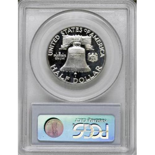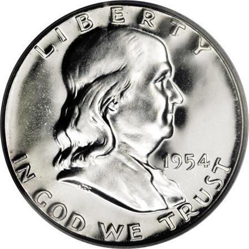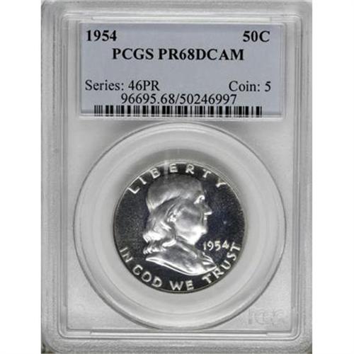 <B>1954 50C PR68 Deep Cameo PCGS.</B></I> While the number of proof Franklin halves struck in 1954 soared to 233,300 pieces, Deep Cameo examples remain elusive today. The frosted effect that created the cameo effect on the most noteworthy coins wore away quickly, and a majority of Franklin proofs for the year are brilliant in appearance.<BR> This incredibly well-preserved specimen is an eye-catching exception. Though the portrait and the Liberty Bell show only moderate frost, the contrast between the devices and the watery fields is bold and undeniable. A small milk spot visits the right obverse field and the reverse exhibits a subtle golden cast, but the surfaces are otherwise untoned. Population: 4 in 68 Deep Cameo, 0 finer (11/07).<BR><I>From The Kallenberg #1 PCGS Registry Set Of Proof Half Dollars.</B></I><BR><BR><b>Shipping:</b> Coins & Currency (<a target="_blank" href="http://www.heritageauctions.com/common/shipping.php">view shipping information</a>)