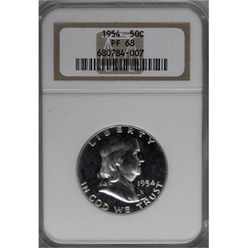 <B>1954 50C PR68 NGC.</B></I> NGC Census: (315/6). PCGS Population (82/1). Mintage: 233,300. Numismedia Wsl. Price for NGC/PCGS coin in PR68: $265. (#6695)<BR><BR><B>Coin Engraver:</B> John R. Sinnock<BR><BR><b>Shipping:</b> Coins & Currency (<a target="_blank" href="http://www.heritageauctions.com/common/shipping.php">view shipping information</a>)