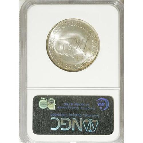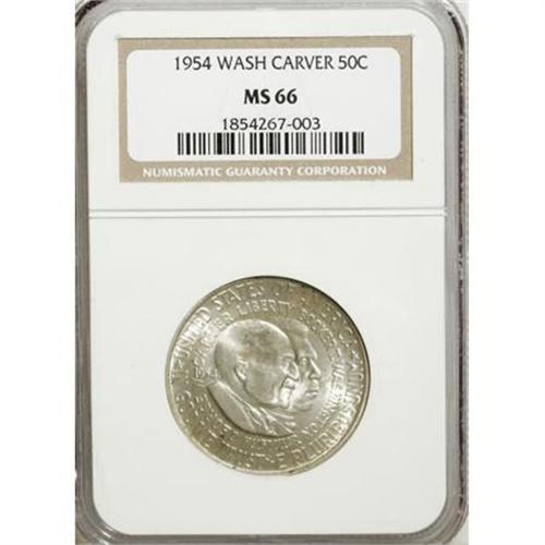 <B>1954 50C Washington-Carver MS66 NGC.</B></I> NGC Census: (29/0). PCGS Population (40/0). Mintage: 12,006. Numismedia Wsl. Price for NGC/PCGS coin in MS66: $1,000. (#9442)<BR><I>From The Frank DuVall Collection of U.S. Commemoratives.</B></I><BR><BR><b>Shipping:</b> Coins & Currency (<a target="_blank" href="http://www.heritageauctions.com/common/shipping.php">view shipping information</a>)