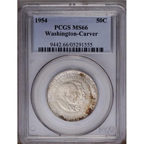 <B>1954<50C> Washington-Carver MS66 PCGS.</B></I> A lustrous dove-gray Premium Gem with dappled russet and honey-gold freckles near the rims. Sharply struck, since even the cheekbone of Carver is nicely brought up. Population: 38 in 66, 0 finer (7/06).
