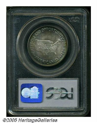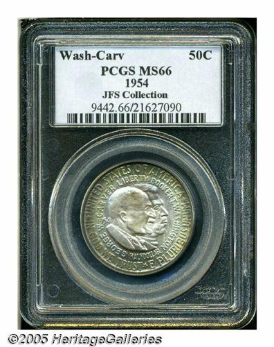 <B>1954<50C> Washington-Carver MS66 PCGS.</B></I> Ex: JFS Collection. Iridescent turquoise-blue, lime-gold, and mint-green at the outer regions adds to the eye-appeal of this lovely, conditionally scarce commemorative. The centers are silver-gray and no oppressive contact marks are seen on either side. Population: 28 in 66, 0 finer (5/05).<BR><I>From The Western Hills Collection.</B></I>