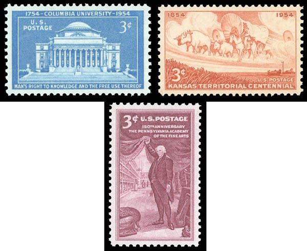 1954-55, 3¢ Columbia University, 3¢ Kansas Territory, and 3¢ Pennsylvania Academy of Fine Arts