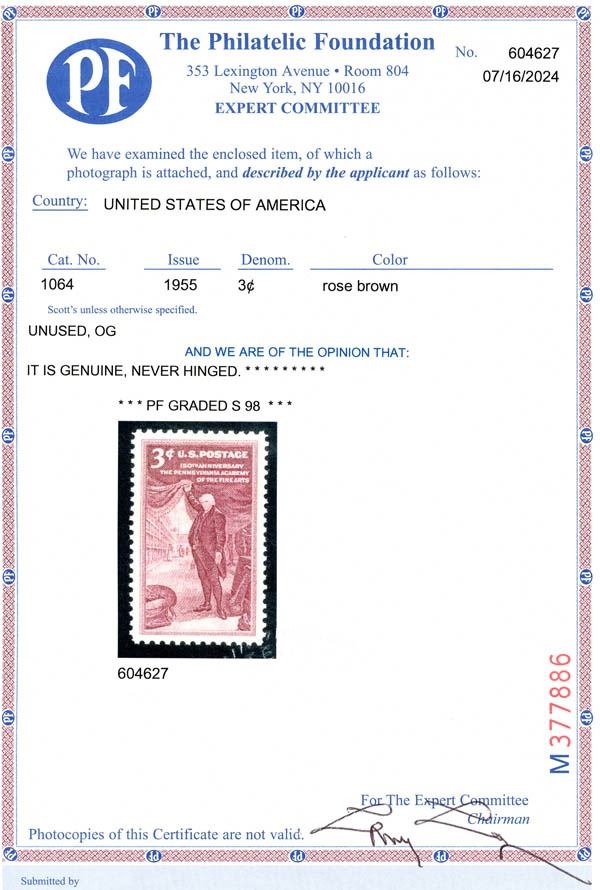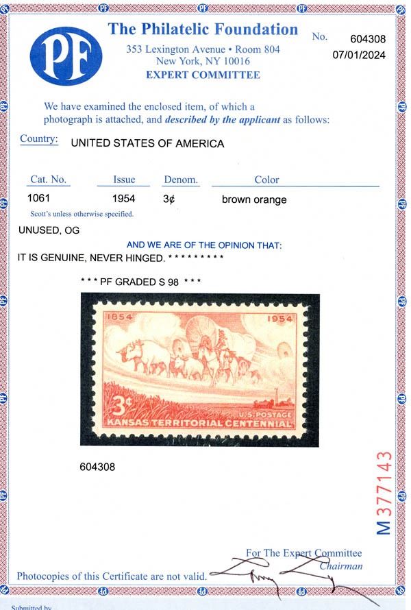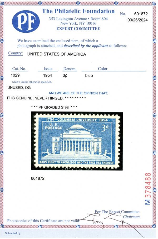 1954-55, 3¢ Columbia University, 3¢ Kansas Territory, and 3¢ Pennsylvania Academy of Fine Arts. Scott 1029//1064. SMQ $190, Sup, each with 2024 P.F. certificate graded SUP 98