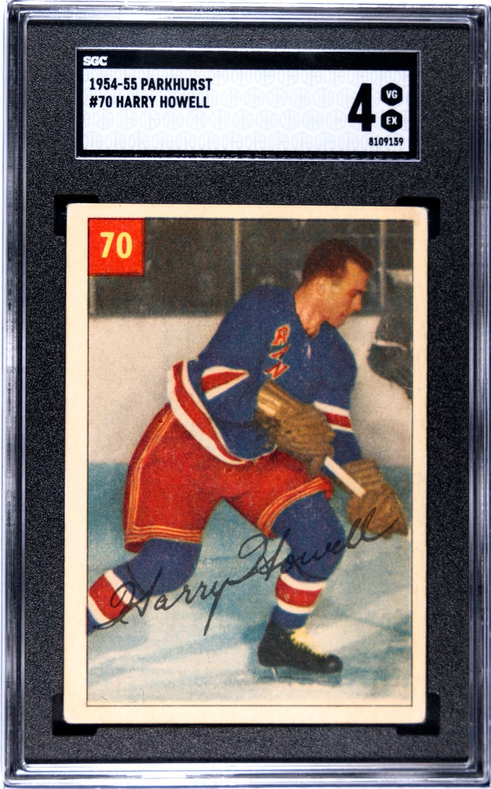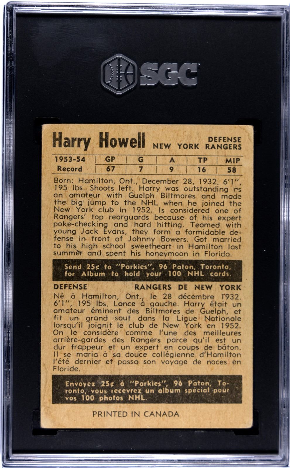 HOFer Harry Howell played forever. Well almost. He broke into the NHL in 1952, and played his last game in the WHA in 1976, a remarkable run of 24 years of big league hockey. He played 1,411 NHL games, and 170 more in the WHA, winning a Norris Trophy in 1967 (the last one awarded before Bobby Orr took the next 8). This, his 2nd year card, is graded 4 VG-EX by SGC.