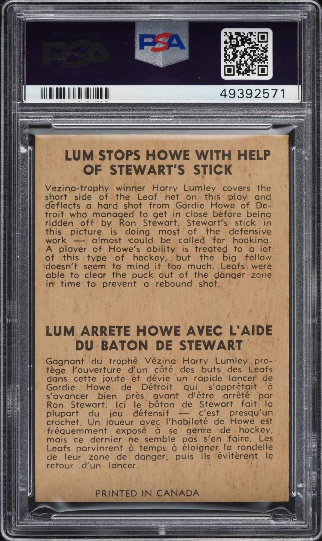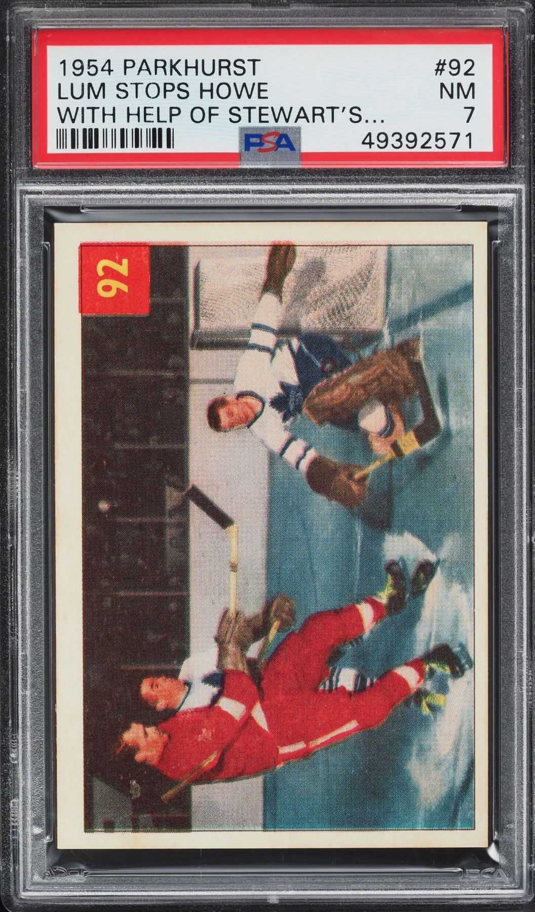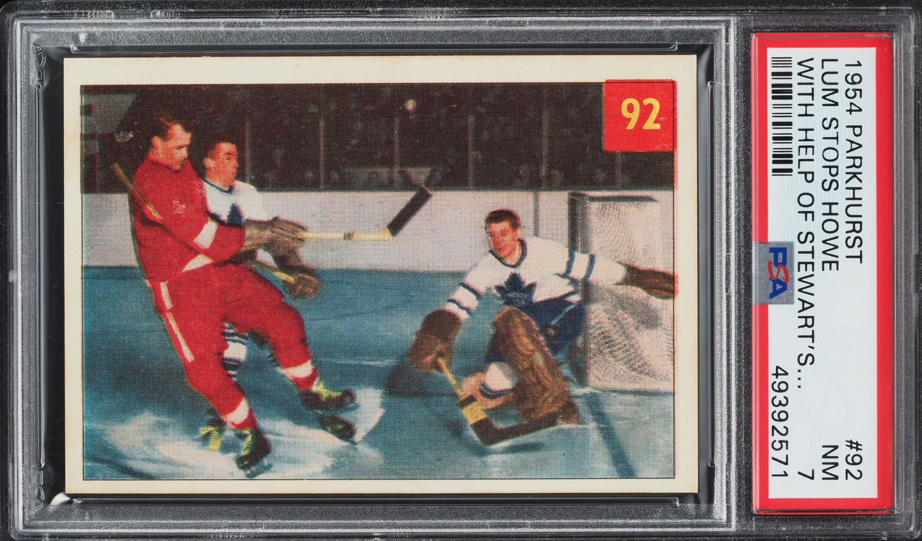 Superb action card with HOFer's doing battle! Goalie Harry Lumley makes an important stop on Mr. Hockey, Gordie Howe. Graded 7 NM by PSA!