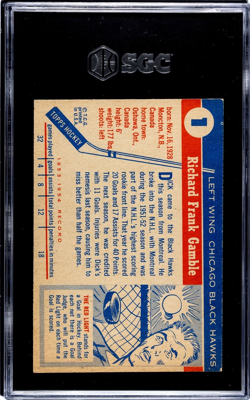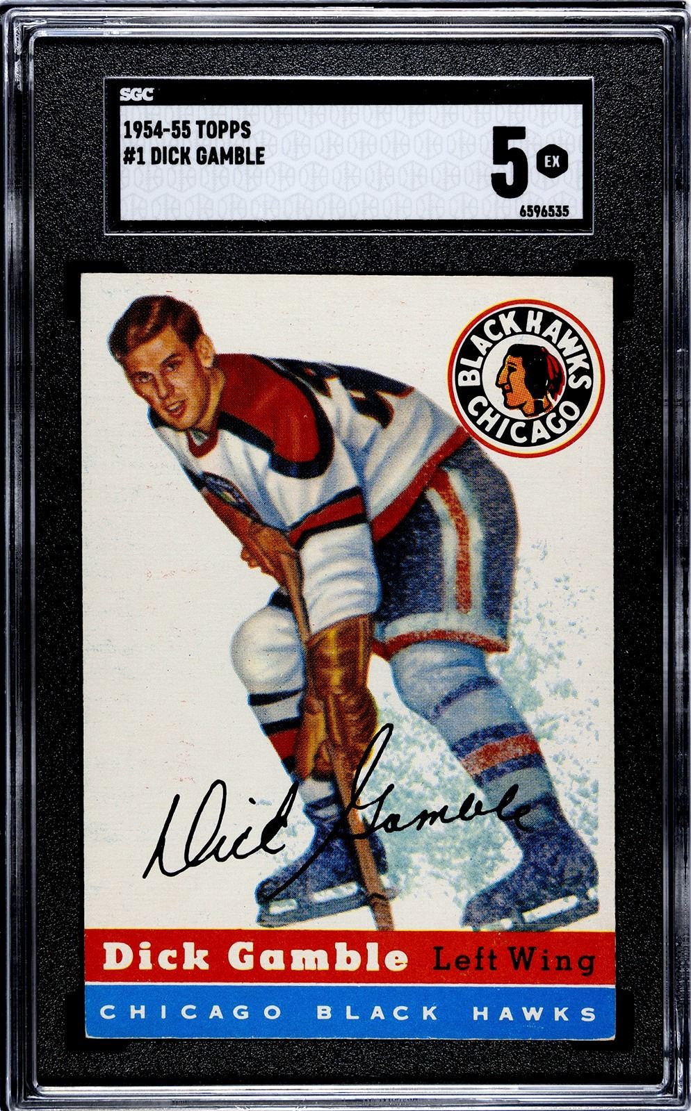 Gamble played parts of several seasons in the NHL, and was part of the Canadiens’ 1953 Stanley Cup-winning team. He had a long and highly successful career in the AHL, particularly with the Rochester Americans, winning multiple Calder Cups (AHL championships) as both a player and a player-coach. He remains one of the top scorers in AHL history and was inducted into the AHL Hall of Fame in 2007. A tough #1 card, graded a sharp 5 EX by SGC.