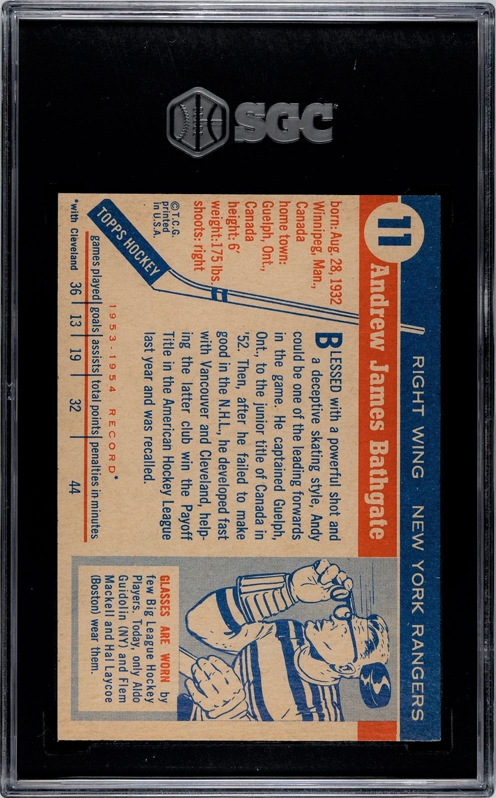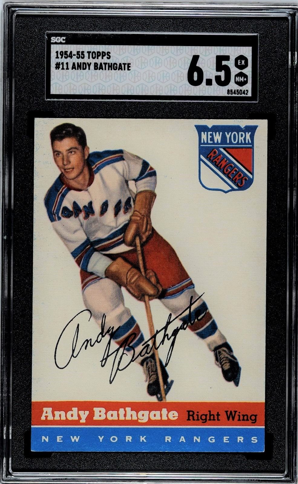 Exceptional 54 Topps Bathgate, NYR great and HOFer, graded a superior 6.5 EX-NM+ by SGC.