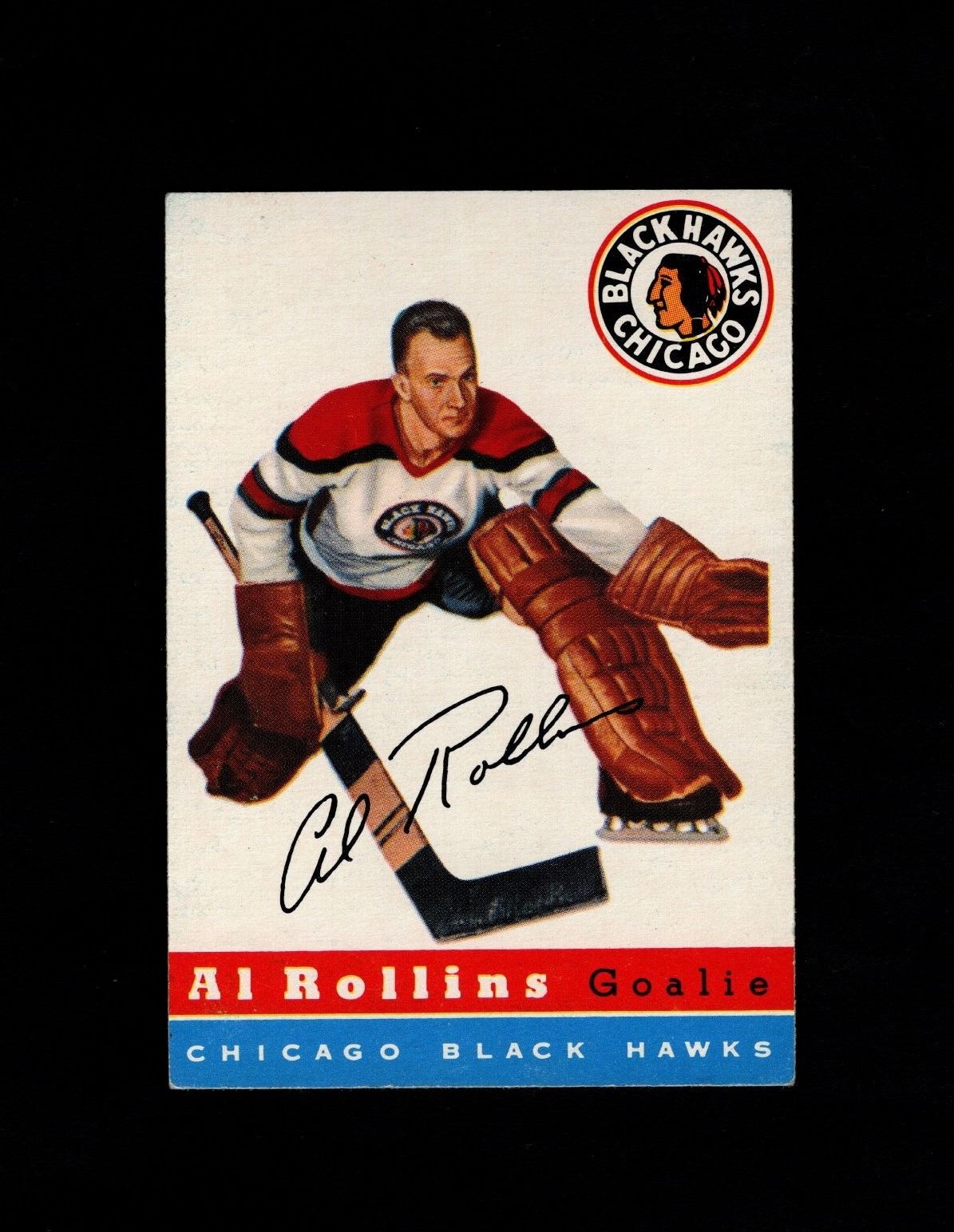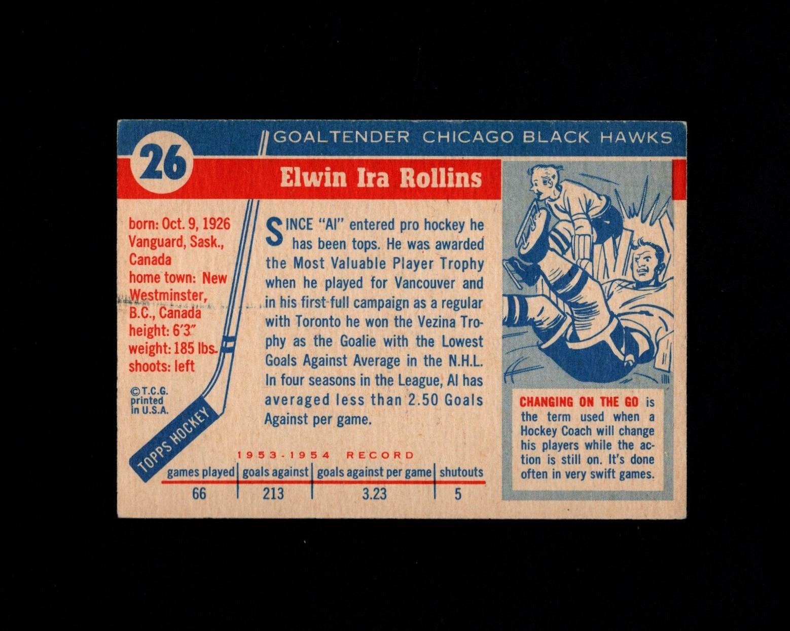 Spectacular issue, the 1954 Topps Hockey set is one of the best vintage designs ever. Al Rollins won a Vezina Trophy, a Hart Trophy as league MVP and a Stanley Cup. Card grades very nice EX/EX+ with amazing colors and gloss!