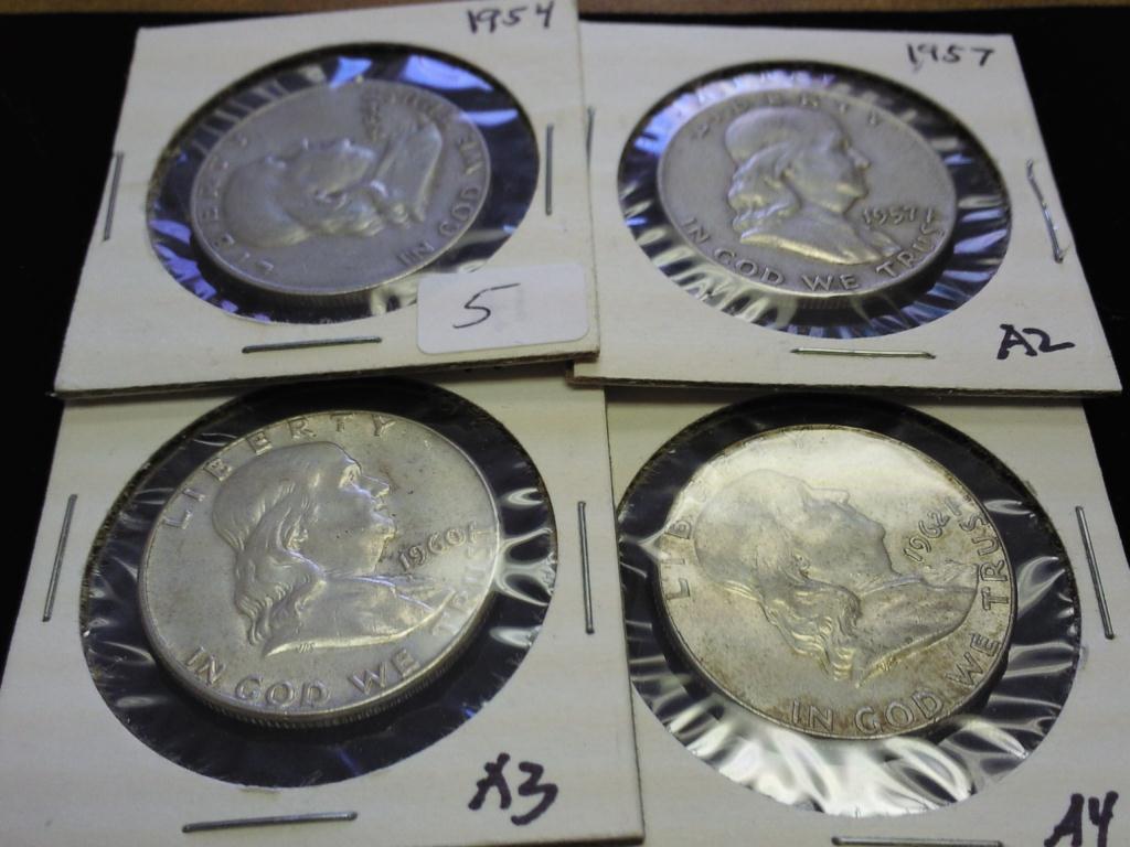 1954, 57, 60 & 62 FRANKLIN HALF DOLLARS