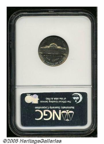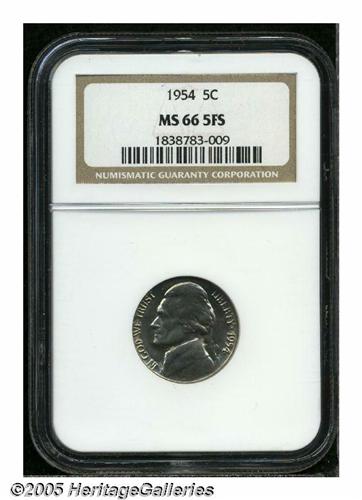 <B>1954<5C> MS66 Full Steps NGC.</B></I> The NGC holder indicates 5 Full Steps. A thin veneer of light champagne patina bathes lustrous surfaces. Some strike weakness is apparent behind the pillars on the portico and the overlying beam. Several minute contact marks are scattered over Jefferson's portrait and Monticello.
