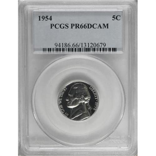 <B>1954 5C PR66 Deep Cameo PCGS.</B></I> Fathomless fields and strongly contrasting, moderately frosted fields are the prime draws of this essentially untoned Premium Gem. Elegantly preserved and delightful. Population: 2 in 66 Deep Cameo, 11 finer (8/07).<BR><BR><b>Shipping:</b> Coins & Currency (<a target="_blank" href="http://www.heritageauctions.com/common/shipping.php">view shipping information</a>)