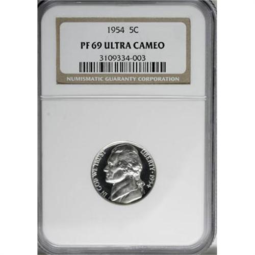<B>1954 5C PR69 Ultra Cameo NGC.</B></I> The only color visible on this Ultra Cameo is a barely discernible splash of light orange on the lower reverse. A powerful strike brings out exquisite detail on all of the frosted design elements, that stand out against the deeply mirrored fields. Both sides are virtually pristine. Census: 1 in 69 Ultra Cameo, 0 finer (10/07).<BR><BR><b>Shipping:</b> Coins & Currency (<a target="_blank" href="http://www.heritageauctions.com/common/shipping.php">view shipping information</a>)