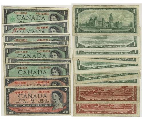 Lot of 16 asterisk notes, mostly VG. Includes 2x1954 *$2.00, *B/B0897329 and *B/B0012394; 1x1967 $1.00 *N/O0123156. 13x1954 *$1.00's, 6 with *A/A prefix and 7x *B/M prefix,no return.