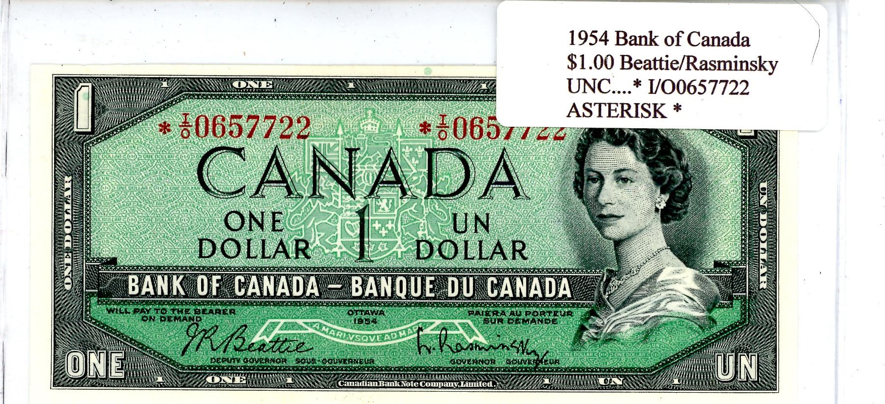 1954 Asterisk Bank of Canada One Dollar bill---Crisp Unc.