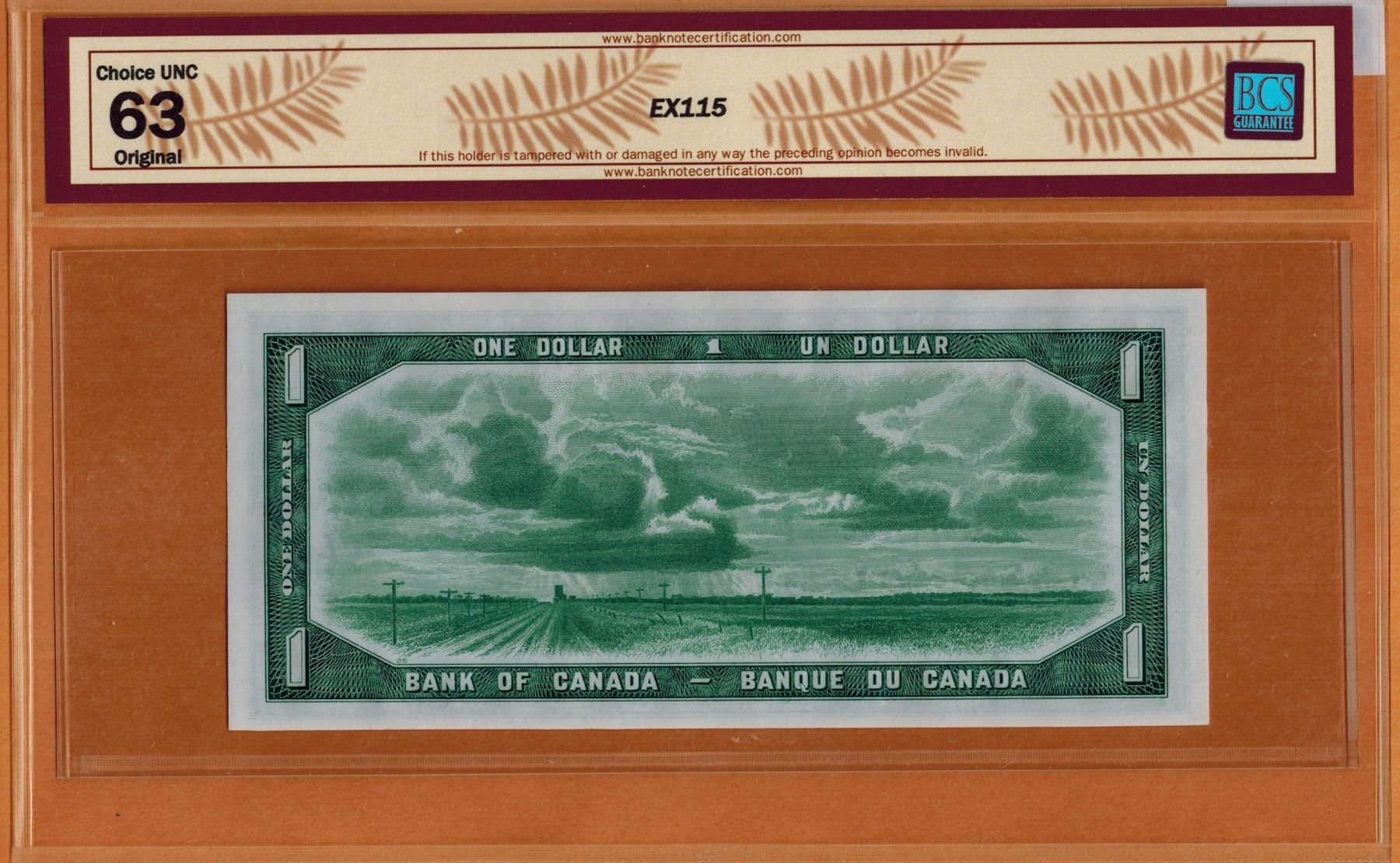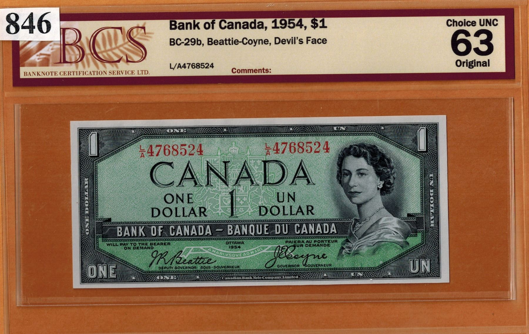1954 BANK OF CANADA $1.00 DEVIL'S FACE BANKNOTE - BCS GRADED - CHOICE UNC 63
