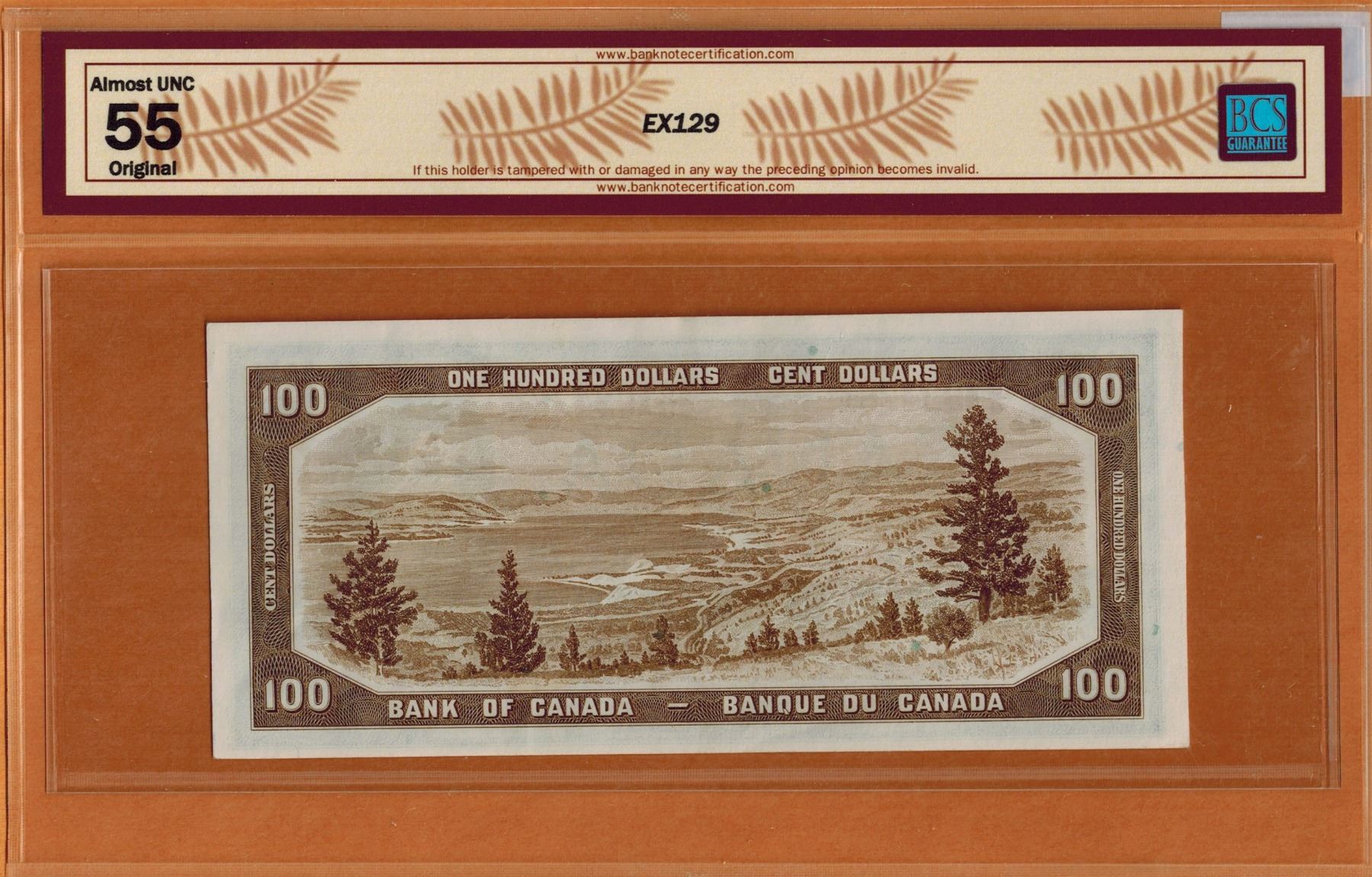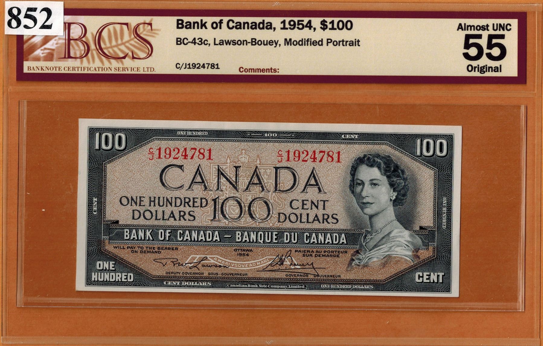 1954 BANK OF CANADA $100 BANKNOTE - BCS GRADED - ALMOST UNC 55
