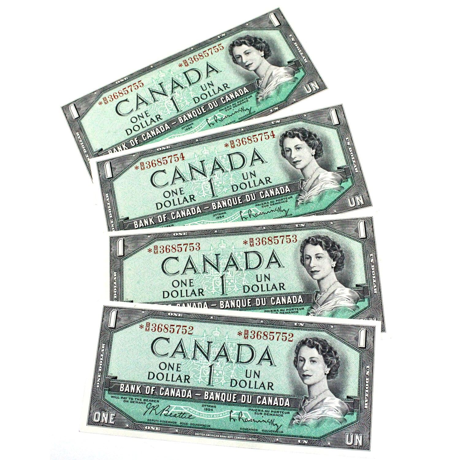 1954 BC-37bA-i Bank of Canada $1 Replacement Notes Beattie-Rasminsky Signatures with Consecutive Serial Numbers *B/M3685752-755 UNC or Better. 4pcs