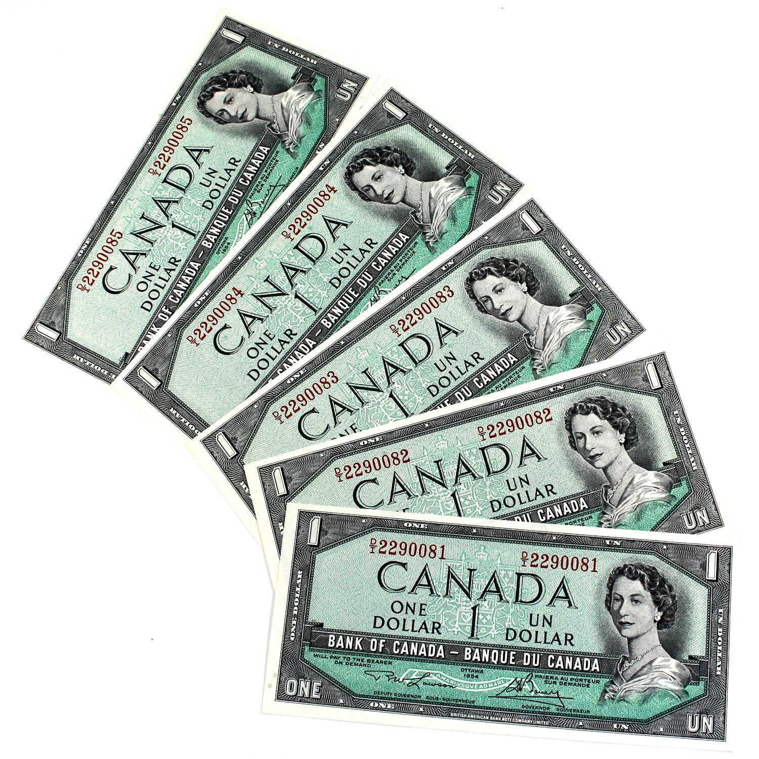1954 BC-37d Bank of Canada $1 Notes Lawson-Bouey Signatures with Consecutive Serial Numbers D/I2290081-085, UNC. 5pcs