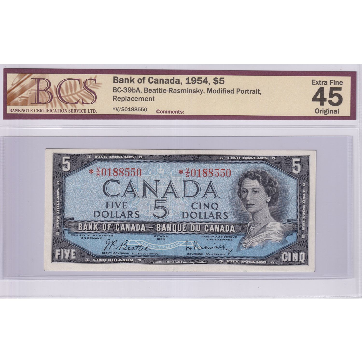 1954 BC-39bA $5, Bank of Canada, Beattie-Rasminsky, Modified Portrait, Replacement, S/N: *V/S0188550, BCS Certified EF-45 Original.