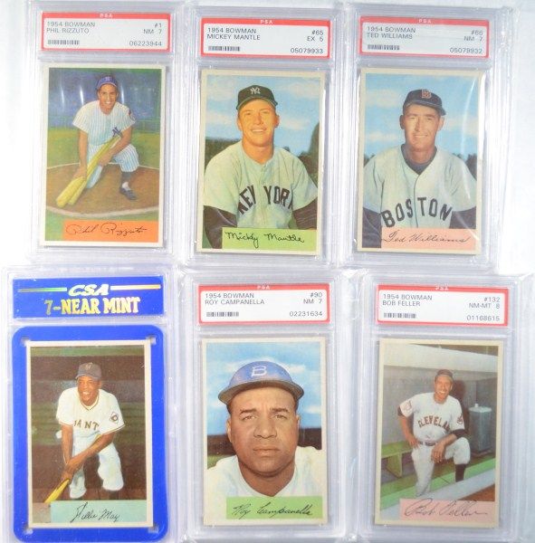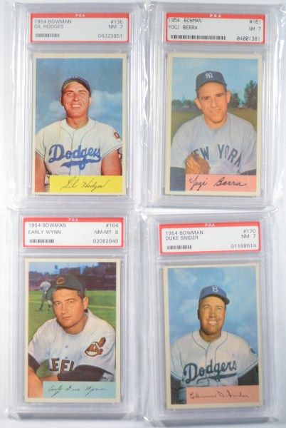 BEAUTIFUL NM-MT SET WITH 9-PSA CARDS, #1 RIZZUTO PSA 7, #65 MANTLE PSA 5, #66 WILLIAMS PSA 7, #89 MAYS NM, #90 CAMPANELLA PSA 7, #132 FELLER PSA 8, #138 HODGES PSA 7, #161 BERRA PSA 7, #164 WYNN PSA 8, 3170 SNIDER PSA 7, REST OF SET IS AWESOME NM-MT, VERY HIGH GRADE SET. SUPER CLEAN, EVERY CARD IN TOP LOAD HOLDER. OVER $3500 IN PSA VALUE ALONE!! ALSO HAS ORIGINAL WRAPPER FROM 1954 PACK INCLUDED.