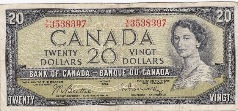 1954 Bank Of Canada $20 Bank Note - Modified Portrait - Y/E Serial # - Beattie/Rasminsky -- Book Value $32