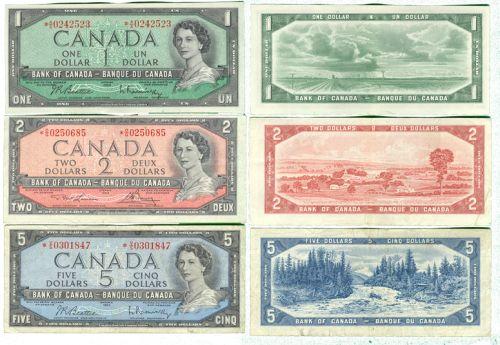 3 asterisk 1954 Modified portrait issues, one each denomination: $1-EF very fresh well centred with light ripple #*A/A0242523, Beattie-Rasminsky; $2-nice VF with centre fold and offcut. #*O/G0250685, Lawson-Bouey; and $5-F/VF with creases and folds. Well