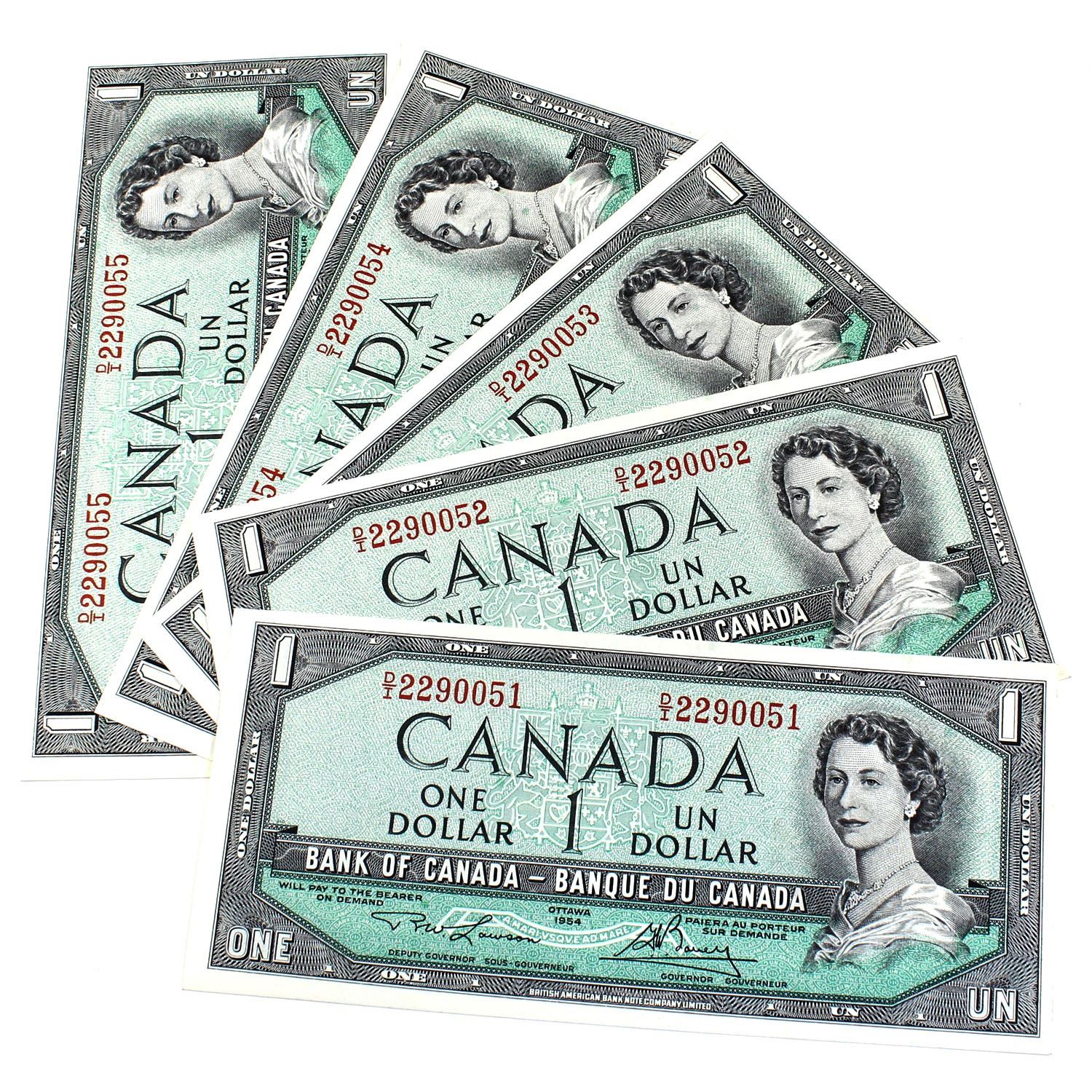 1954 Bank of Canada $1 Lawson-Bouey Signatures with Consecutive Serial Numbers D/I2290051-055 UNC. 5pcs