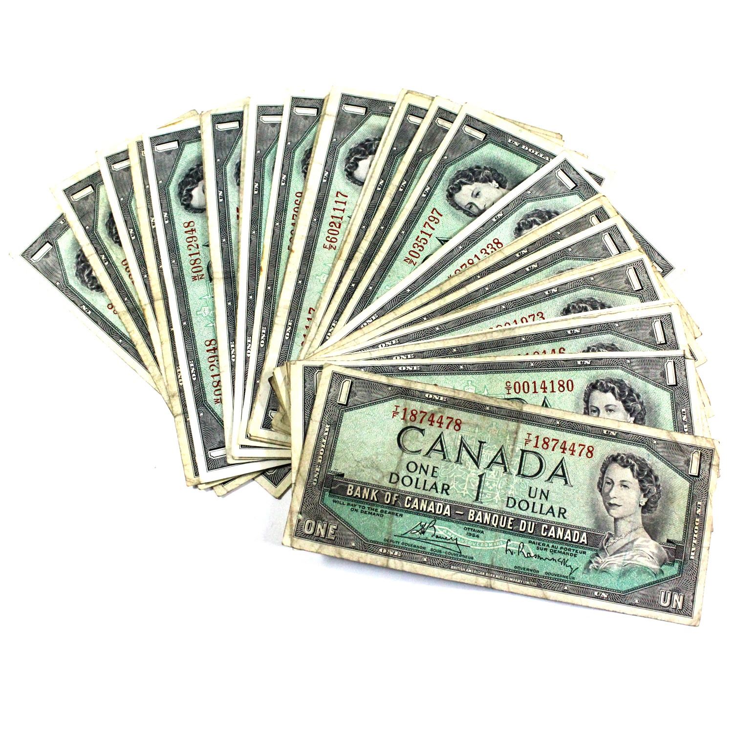 1954 Bank of Canada $1 Notes - 23x Beattie-Rasminsky, 7x Lawson-Bouey & 1x Bouey-Rasminsky Signatures with a Good Mix of Prefixes. 31pcs