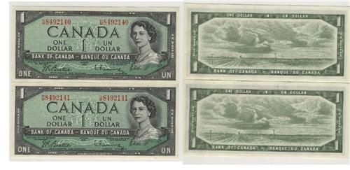 Sequential pair, crisp unc. Fresh with counting crease, #H/M8492140-8492141. Beattie-Rasminsky, BC-37b-I, no return.