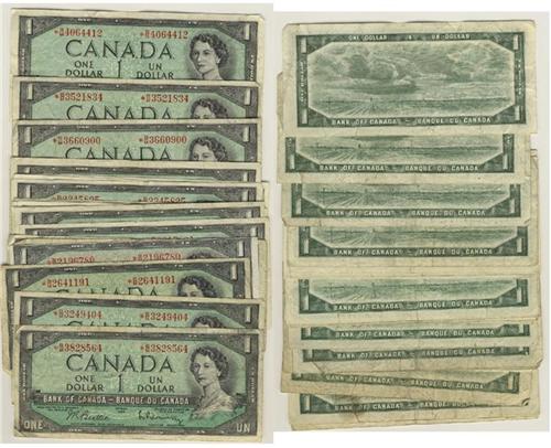21 circulated VG-aEF asterisk notes. *B/M prefix with miscellaneous serial numbers. 1 note torn and taped. 1 has light pencil marking on face. Beattie-Rasminsky BC-37bA-i, no return.
