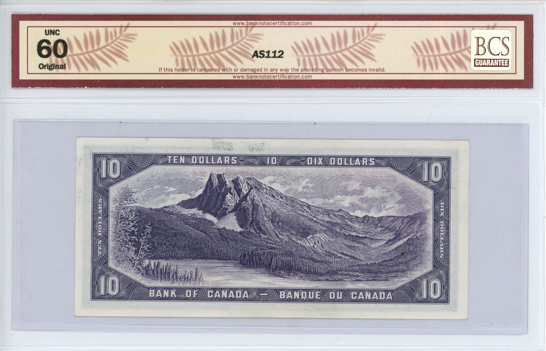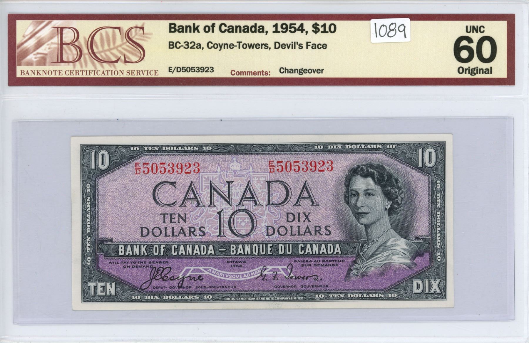 1954 Bank of Canada $10.00 bill *Devil's Face* BCS graded UNC 60