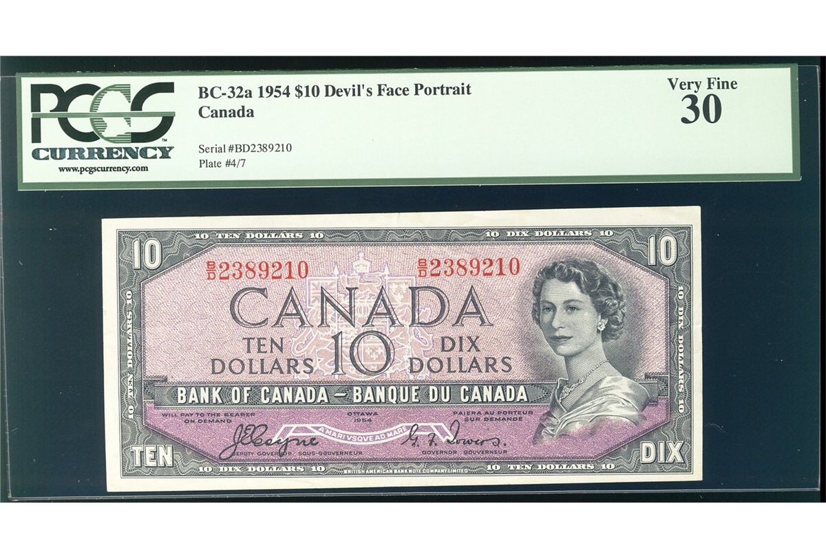 1954 Bank of Canada; 10 Dollars, BC-32a Devil's Face #BD2389210 PCGS VF30.