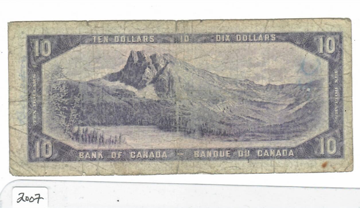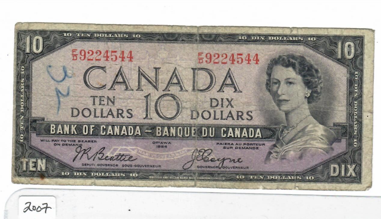 1954 Bank of Canada $10 bill with Devil's face in hair -- Note: bill is faded