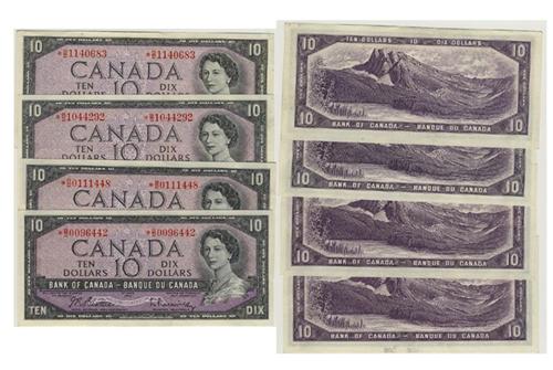 4 very fresh, crisp asteriskisk replacement notes. Evenly centred, counting crease and light waffling. *B/D prefix, #'s 0096442; 0111448; 1044292; and 114063. BC-40bA, no return.