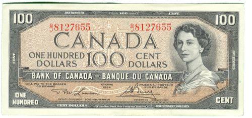 Choice fresh color, crisp and nicely centered. Queen Elizabeth issue with Lawson-Bouey signature. #B/J8127655. Lightly mishandled with counting crease, light waffle and minor corner pushes. BC-43c (no return).