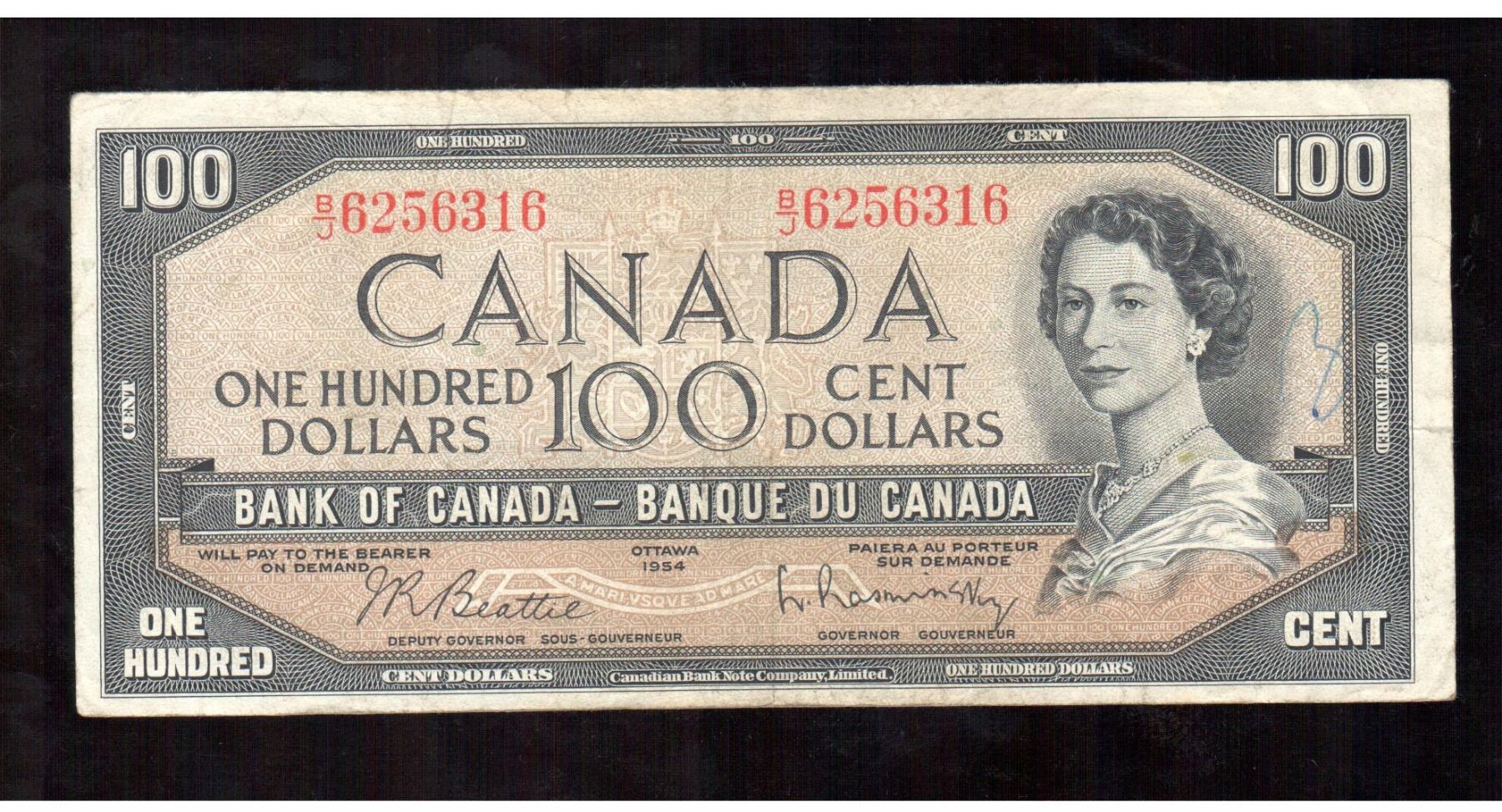 Lot 116; Dates include 1954, $100 note Beattie-Rasminsky BJ Prefix VF-EF average grade