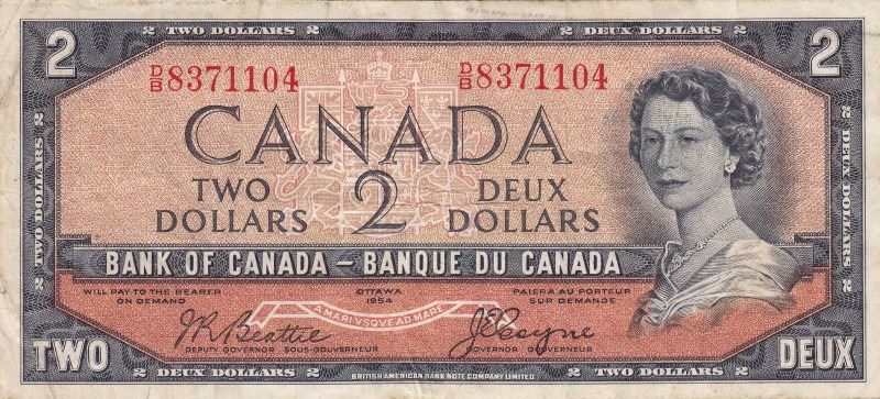 1954 Bank of Canada $2 Bank Note - Devil's Face Portrait - Beattie / Coyne - VF + Condition